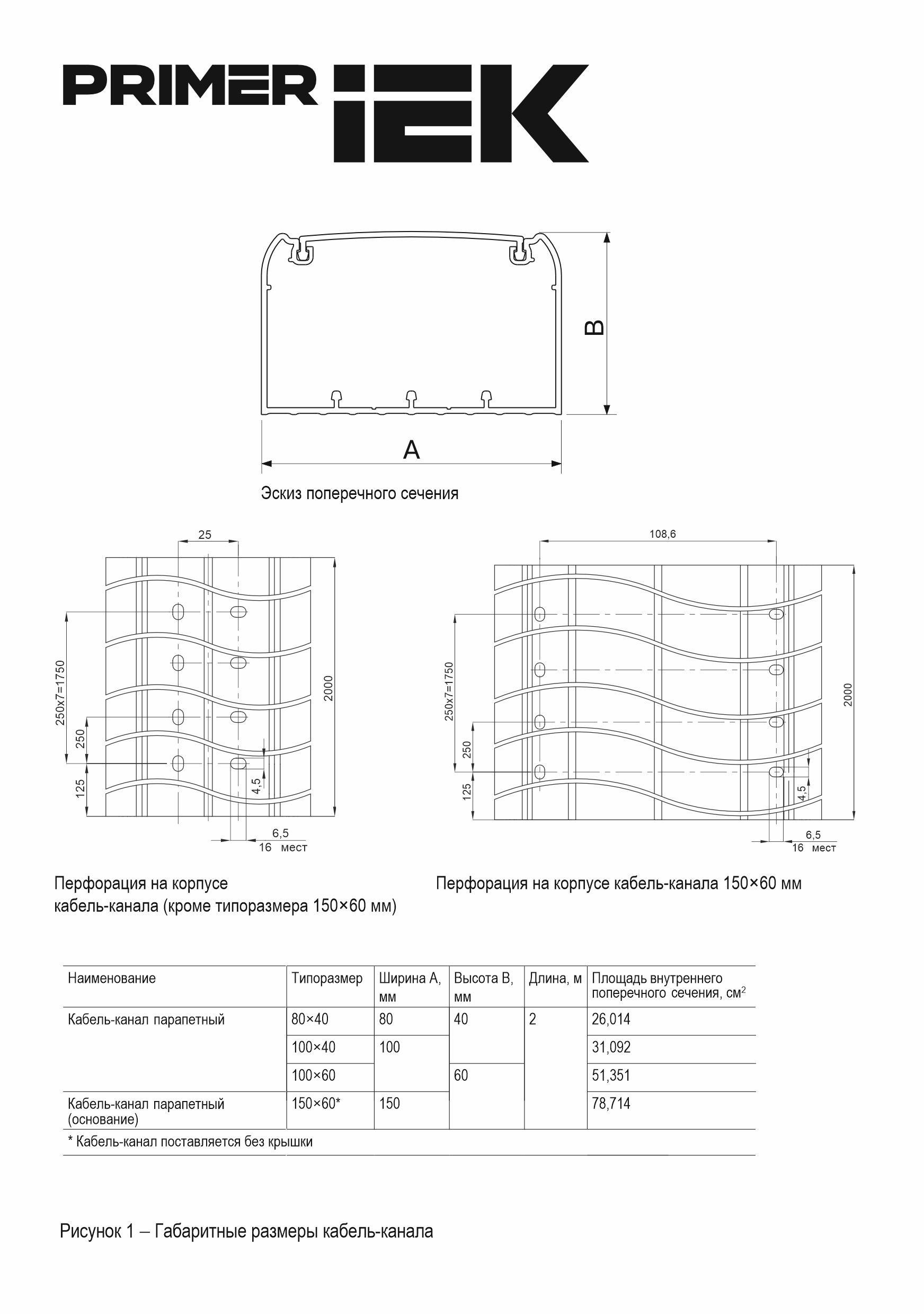 Кабель-канал парапетный ПРАЙМЕР с крышкой. Предназначен для прокладки кабелей различного типа, установки электроустановочных изделий и организации рабочего места. Выпускаются в отрезках длиной 2 метра с самоклеющейся защитной пленкой по всей длине основания и крышки. Возможность установки перегородки (до 3-х штук) для разделения внутреннего пространства кабель-канала. Монтажные отверстия (с горизонтальным и вертикальным расположением) по всей длине основания короба с диаметром отверстий 6,5 мм, шаг перфорации – 250 мм. Материал: ПВХ. Цвет: белый.